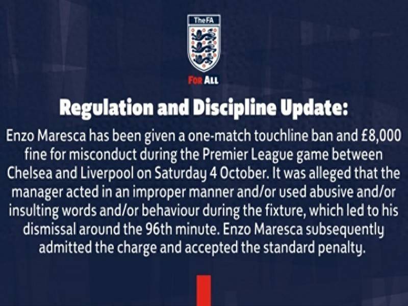 根据英足总的公告,在切尔西与利物浦的比赛中,比赛进入第96分钟,马雷斯卡因使用侮辱性言语被主裁判出示红牌,罚离场。因为这一行为,马雷斯卡将被禁赛一场,并且还需支付8000英镑的罚款。马雷斯卡已经承认自己确实违反了规定,并愿意接受相关的处罚。